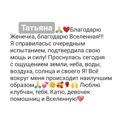Благодаря нашей совместной работе, все больше людей начинают менять свою жизнь, достигать своих целей, избавляться от обид, гнева, стыда и других разрушающих чувств, налаживать отношения с собой и семьей, улучшать финансовое положение.