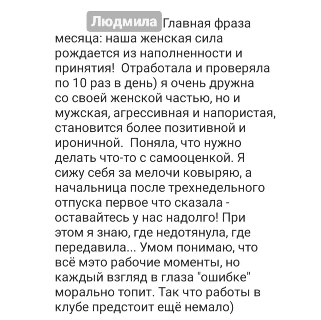 Мой Клуб «Новая реальность» работает с января 2020 года. Уже более 200 человек стали его участниками. Кого-то привлекло движение к цели, кто-то хотел попасть на терапию ко мне, кому-то было важно подробно изучить одну из тем. Клуб не стоит на месте, а растет, меняется, улучшается. И появление практикумов позволит не только клубчанам начать менять свою жизнь.